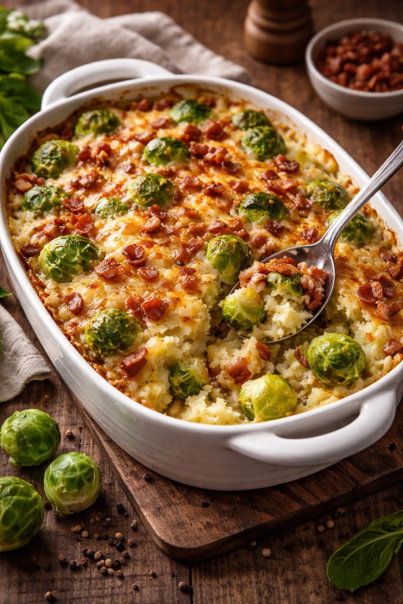 Hartige schotel met zachte spruitjes, knapperige spekjes en romige aardappelpuree.